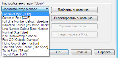 - В разделе "Настройка аннотации "Орто" в раскрывающемся списке выберите аннотацию, например "Низ трубы (BOP)". Нажмите кнопку "Добавить аннотацию". Лучше изменить копию элемента, а не его оригинал.