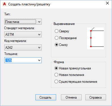 Задает форму пластины или решетки. Возможные варианты: "Новая прямоугольная", "Новая полилиния", "Существующая полилиния".