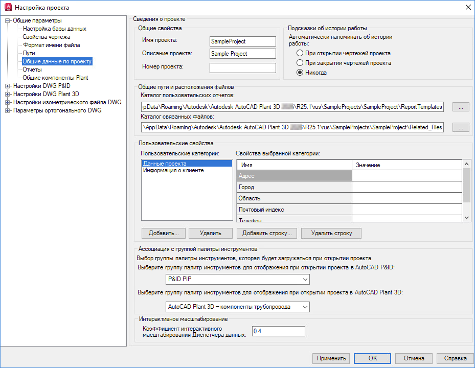 В прочие общие проектные сведения входят пути, журнал истории работы, параметры запросов, настройки зумирования Диспетчера данных и связь группы инструментальных палитр.