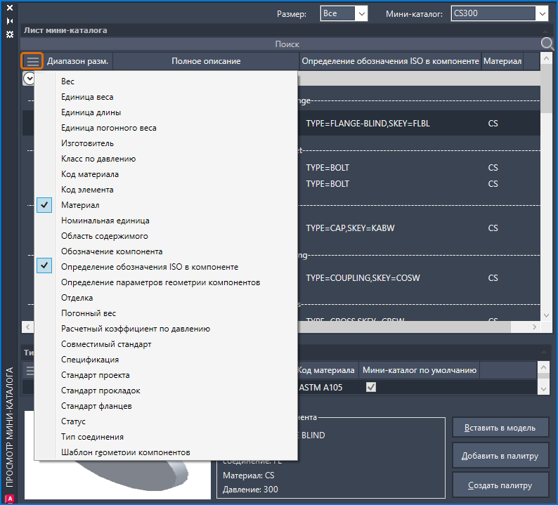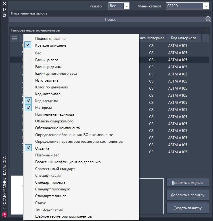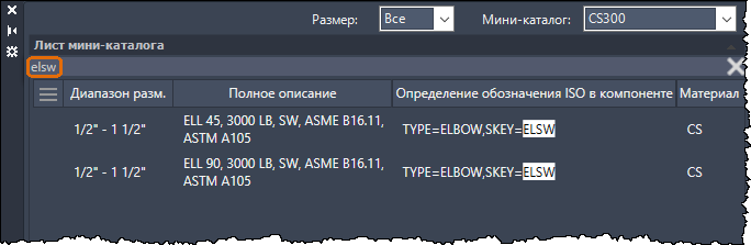 Есть возможность просмотра всех деталей для определенного размера в выбранном мини-каталоге. Любые изменения в списках размеров и мини-каталогов обновляются в средстве просмотра мини-каталогов труб и на панели «Вставка элементов» на ленте.