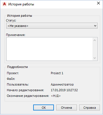 Также можно ввести статус и примечания в диалоговом окне "История работы", если администратор проекта настроил отображение диалогового окна при открытии или закрытии чертежа. Обратите внимание, что оно не является средством хранения, получения или контроля версий чертежа.