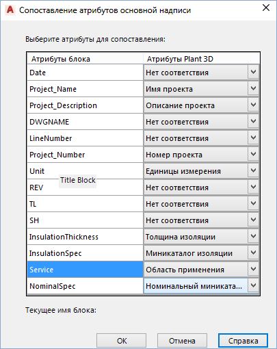 Сопоставляет атрибуты основной надписи со свойствами Plant 3D.