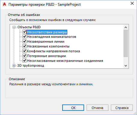 В диалоговом окне "Параметры проверки P&ID" в структуре "Отчеты об ошибках" разверните объекты P&ID и узлы "Базовые объекты AutoCAD". Установите флажки для типов ошибок, которые следует помечать при проверке проекта.