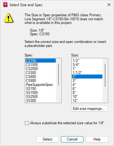 - Если размер или мини-каталог не совпадают, в диалоговом окне «Выбор размера и мини-каталога» выполните такие действия.