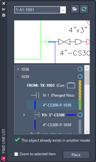 В перечне линий P&ID представлены сегменты линии и связанные компоненты, которые отображаются в указанном чертеже P&ID. Можно щелкнуть любой доступный сегмент линии и разместить в 3D модели его эквивалент Plant 3D.