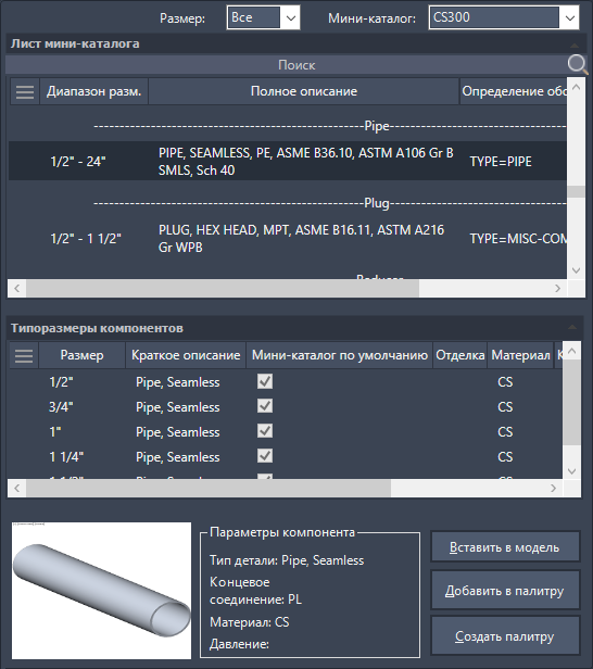 Отображение текущего миникаталога в программе AutoCAD Plant 3D toolset, открытие и просмотр листа миникаталога, вставка детали из этого листа в модель и изменение инструментальных палитр.