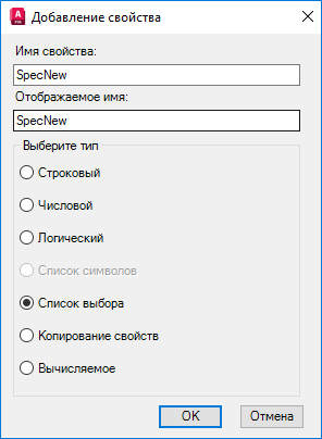 В поле «Имя свойства» введите имя для нового свойства (например, SpecNew). Имя не может содержать пробелов.