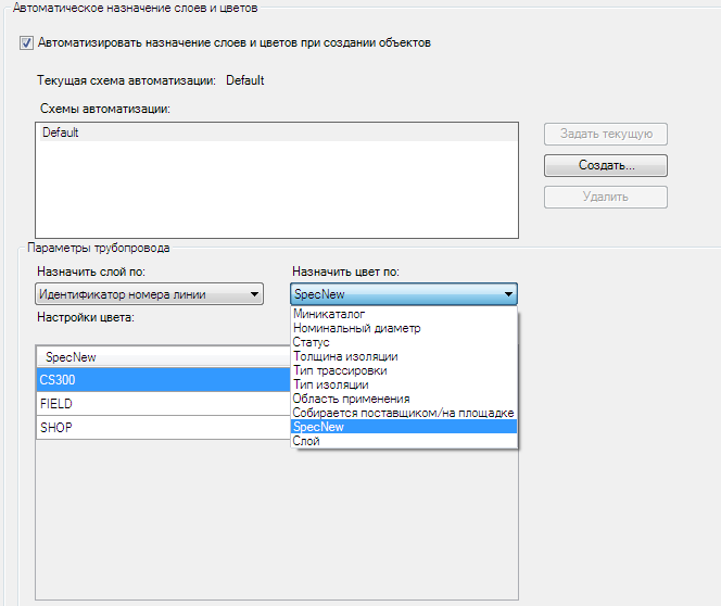 В области «Автоматическое назначение слоев и цветов» в списке «Назначить цвет по» выберите новый элемент.