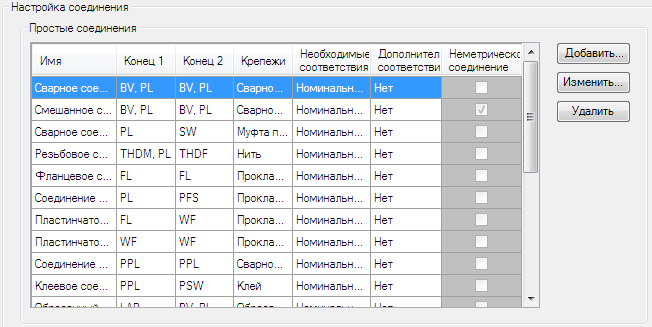 - Простое соединение задает крепежи (например, сварки или наборы болтов), которые используются для скрепления трубы. Простые типы соединений по умолчанию, например сварные, с фланцами и с углублениями, предназначены для соединения трубы с совпадающим номинальным диаметром. Детали, которые поддерживают соединение (например, прокладки), также указываются в простом соединении.