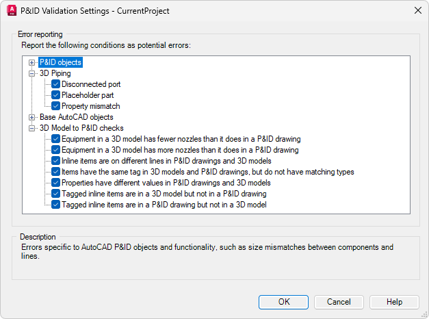 Существует два типа проверки: один только для модели, а другой для модели с учетом связанного чертежа P&ID.