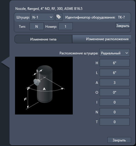 Задает свойства положения для нового или измененного штуцера.