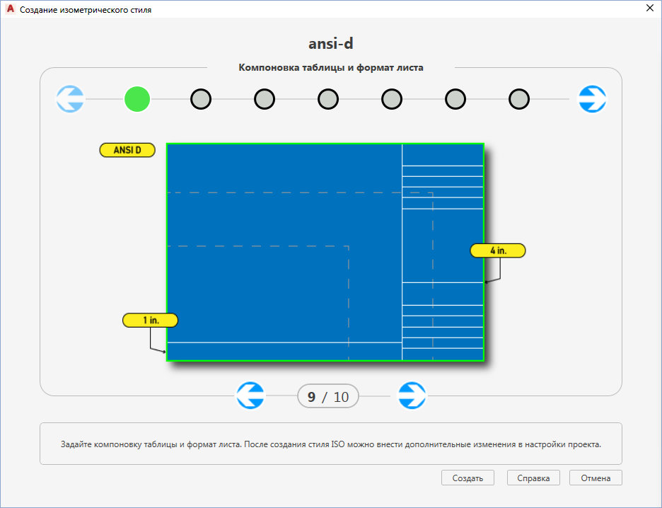 В нижней части окна щелкните стрелки влево и вправо для выбора компоновки таблицы и размера листа. Например, выберите ANSI D и 4 дюйма. Область ведомости материалов находится слева.