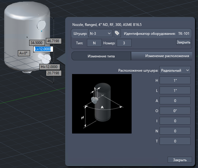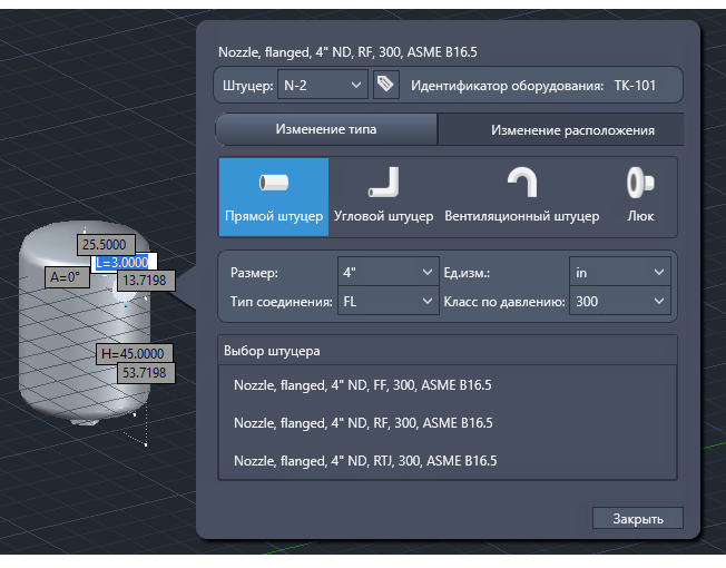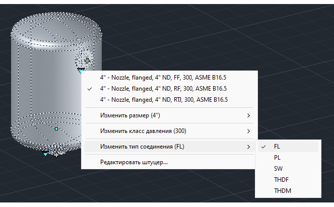 На готовом оборудовании, а также преобразованных 3D-телах можно добавлять штуцера и указывать их типы, свойства, расположение, направление и размеры.