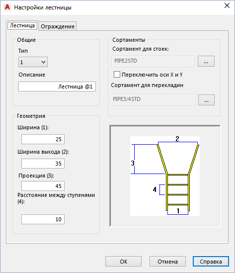 Позволяет задать параметры по умолчанию для создания лестниц.