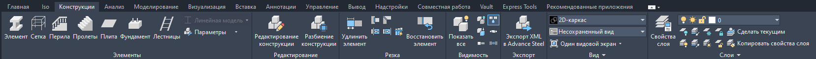 На вкладке "Конструкции" отображаются параметры для работы с конструкциями. Данная вкладка содержит следующие панели: