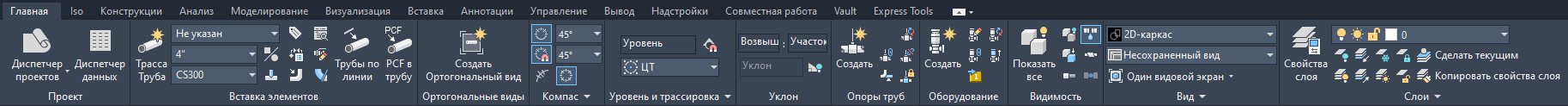 Вкладка "3D трубопровод - главная" является частью рабочего пространства "3D трубопровод".