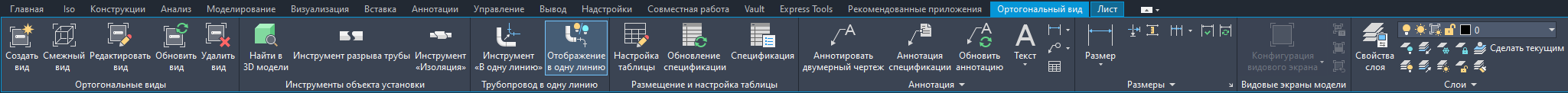 На контекстной вкладке ленты «Ортогональный вид» содержатся параметры для работы с двумерными чертежами. Вкладка содержит следующие панели: