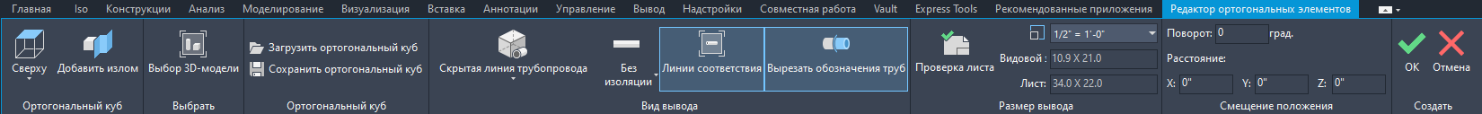 На контекстной вкладке ленты «Редактор ортогональных элементов» содержатся параметры для работы с конфигурациями ортогонального вида. Вкладка содержит следующие панели: