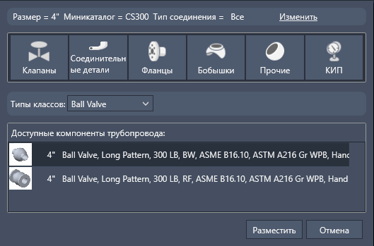 Задает компонент для размещения. Используется для отображения компонентов трубопровода, соответствующих текущему миникаталогу, размеру и типу соединения, а также для отображения описания.