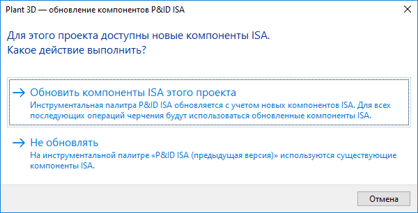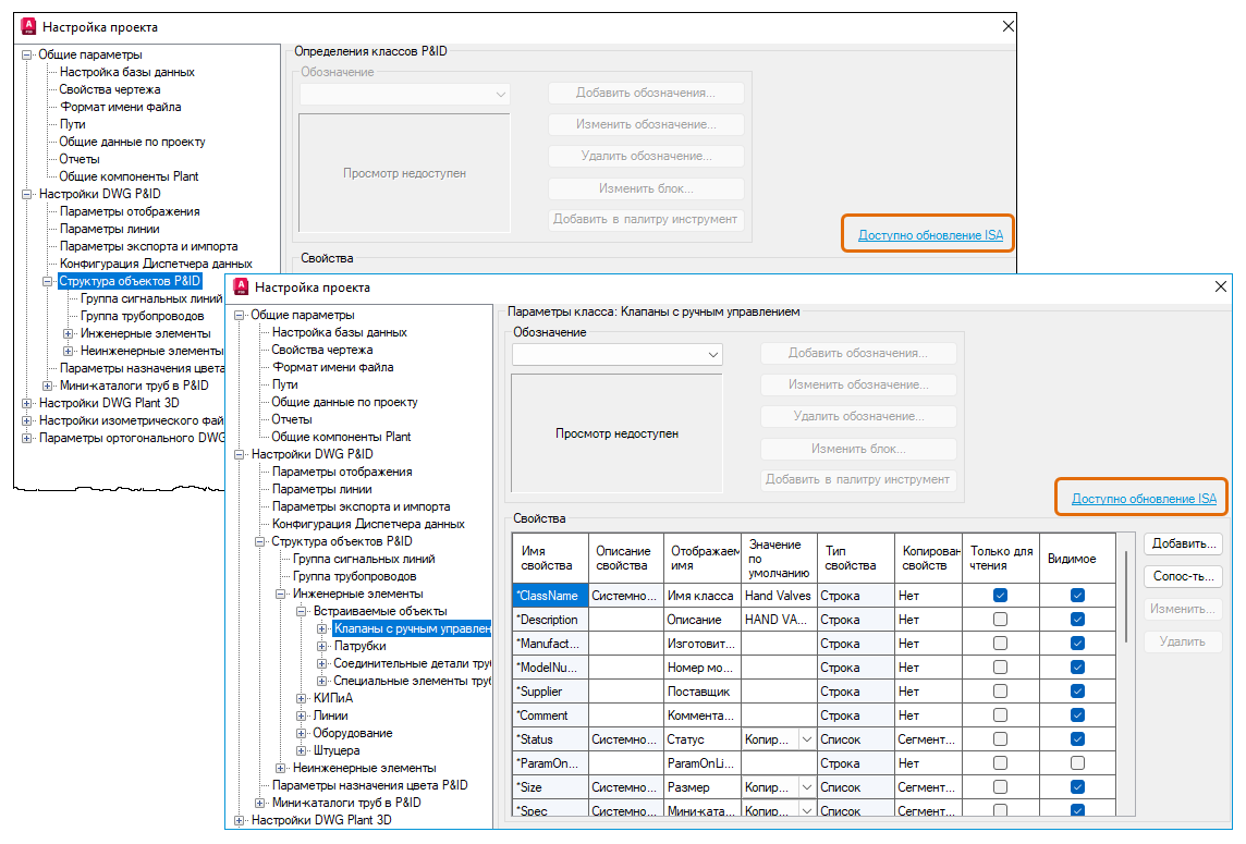 Кроме того, была реализована проверка проектов ISA предыдущих версий при их открытии. При открытии проекта ISA, созданного в более ранней версии, в узле «Определения классов P&ID» и на каждой дочерней странице отображается ссылка «Доступно обновление ISA». Нажмите ссылку, чтобы открыть диалоговое окно «Plant 3D — обновление компонентов P&ID ISA».