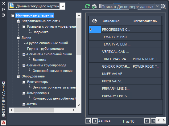 С помощью Диспетчера данных можно просматривать, изменять, импортировать и экспортировать данные чертежей и проектов, а также создавать различные отчеты.