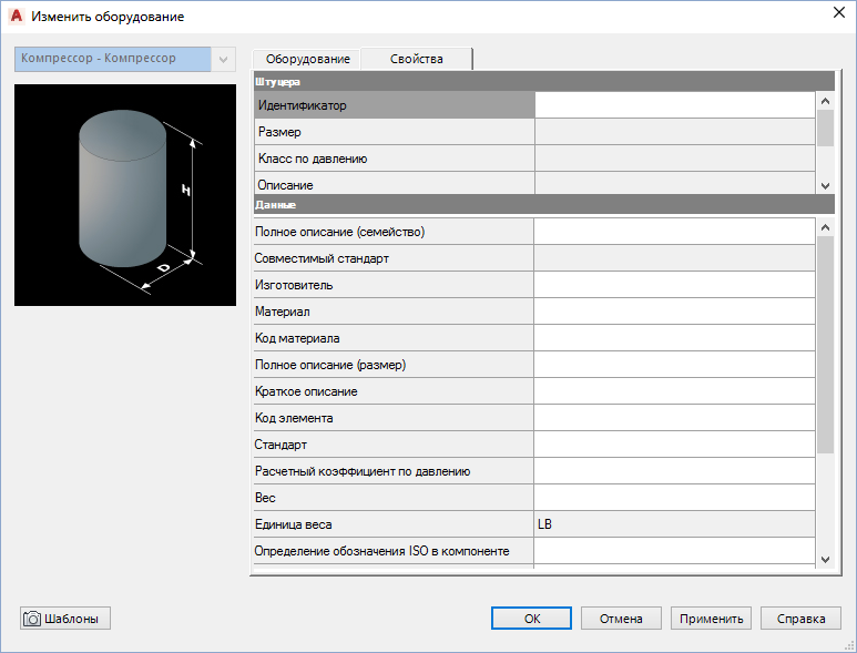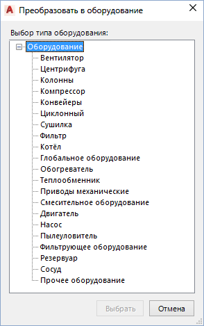 В диалоговом окне "Преобразовать в оборудование" выберите класс оборудования, который нужно назначить объекту (например, "Компрессор"), таким образом, преобразованный объект будет идентифицирован в Диспетчере данных, палитре свойств и отчетах. Нажмите кнопку "Выбрать".