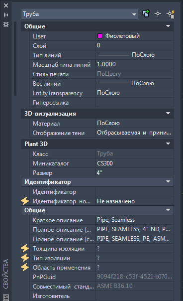 На палитре свойств можно изменить данные объекта (например, миникаталог трубы, тип изоляции или толщину, и т. п.). С помощью палитры свойств также можно открыть диалоговое окно "Присвоить идентификатор", предназначенное для изменения информации идентификатора.