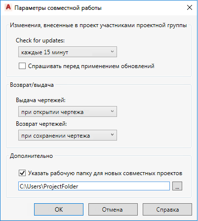 «Параметры»Интервал времени: проверка сервера для загрузки файлов и данных проекта, которые были обновлены участниками рабочей группы с интервалом, заданным в поле со списком. По умолчанию обновление проекта выполняется автоматически с заданным интервалом.