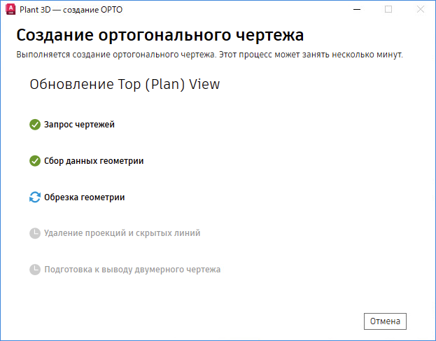 Для оптимальной производительности рекомендуется избегать выполнения других операций в приложении в процессе формирования двумерных чертежей. Чтобы остановить процесс создания двумерного чертежа в любой момент, нажмите кнопку «Отмена» в диалоговом окне «Создание ОРТО».