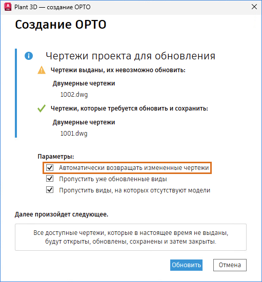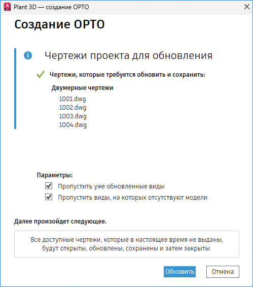 - «Пропустить уже обновленные виды»: этот параметр игнорирует виды, которые уже являются актуальными на момент создания двумерного чертежа.