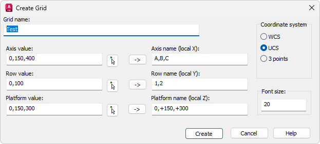 Чтобы задать систему координат для создания сетки, в разделе "Система координат" щелкните "МСК", "ПСК" или "3 точки". При выборе пункта "3 точки" укажите начало координат и направление трех осей сетки.