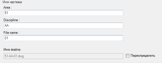 - Указывает новое имя файла. Если исходное имя файла было создано с использованием формата имени файла, например такого, в котором объединены площадь, категория и номер, разделенные символом "-", в диалоговом окне "Переименование DWG" будут следующие поля: