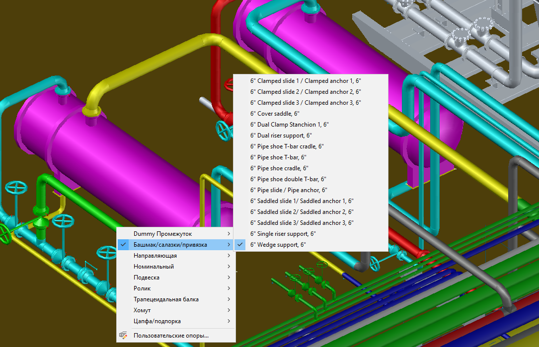 Можно добавить опоры труб в 3D-модель из мини-каталога опор труб проекта или создать пользовательскую опору трубы.