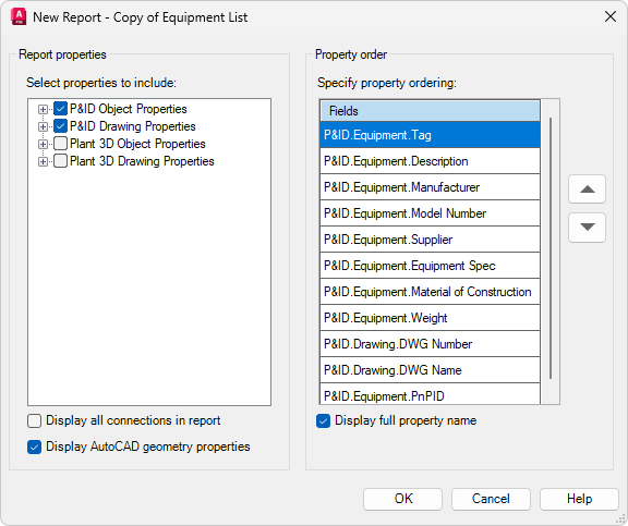 В случае создания шаблона отчета Plant 3D можно указать свойства объекта или чертежа Plant 3D и соответствующим образом их упорядочить. Данные Plant 3D включаются в отчет только при условии, если в проекте существует соответствующий объект P&ID с идентичным идентификатором.