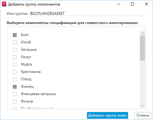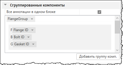 - В аннотации «Идентификатор спецификации (компоненты)» можно настроить группу компонентов и выполнить следующие действия.