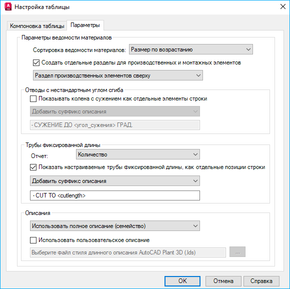 - Установите или снимите флажок "Использовать пользовательское описание". Установив флажок, нажмите кнопку [...], чтобы найти необходимый файл стиля полного описания AutoCAD Plant 3D toolset (.lds). Этот файл будет определять формат для всех описаний в ведомости материалов. Нажмите "ОК".
