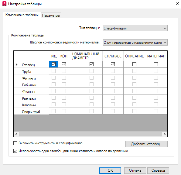 - Выберите «Использовать один столбец для мини-каталога и класса по давлению», чтобы объединить свойства мини-каталога и класса по давлению в одном столбце.