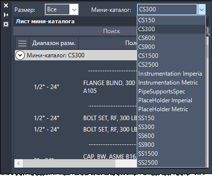 В раскрывающемся списке выберите миникаталог трубы (например, CS300).
