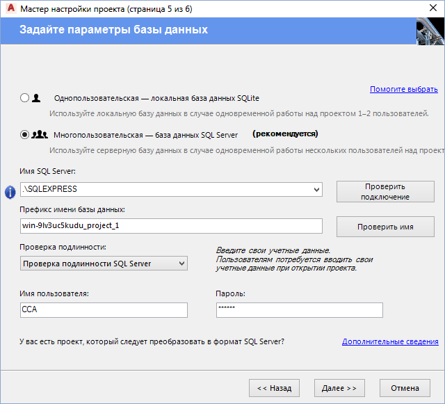 - В окне "Мастер настройки проекта (страница 5 из 6)" либо выберите базу данных по умолчанию и нажмите "Далее", либо выберите базу данных сервера SQL Express. В случае выбора базы данных сервера выполните следующие действия.