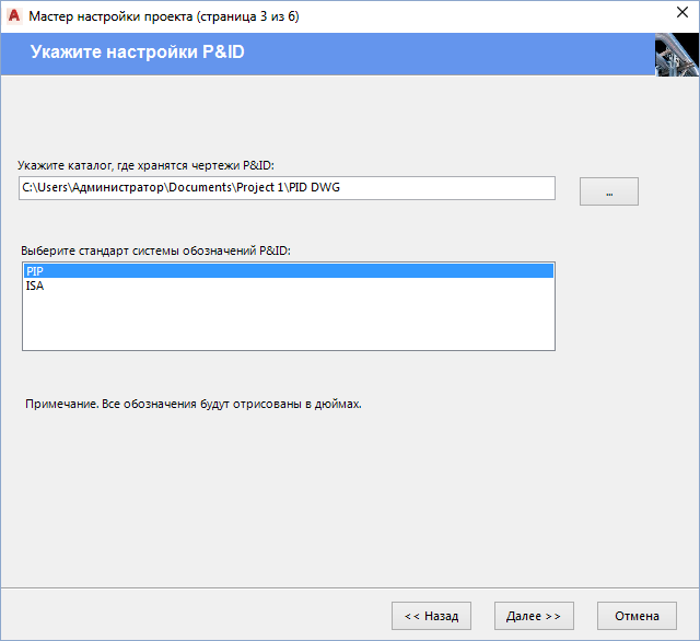 - В окне "Мастер настройки проекта (страница 3 из 6)" введите путь для чертежей P&ID и выберите стандарт для компонентов инструментальной палитры P&ID. Нажмите "Далее".
