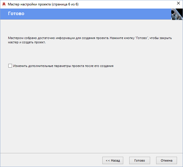 - В окне "Мастер настройки проекта (страница 6 из 6)" установите флажок "Редактировать свойства проекта после его создания", если требуется изменить параметры проекта по умолчанию. Нажмите кнопку "Готово".