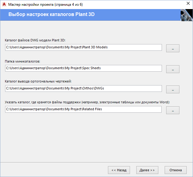 - В окне "Мастер настройки проекта (страница 4 из 6)" введите пути для моделей, листов миникаталогов и ортогональных чертежей. Нажмите "Далее".