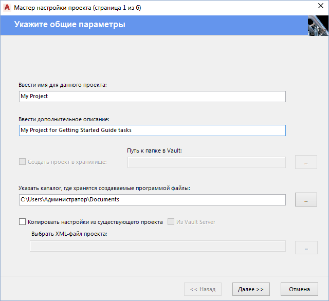 Прим.: Если для текущего проекта требуется использовать ту же структуру папок, что и для существующего проекта, установите флажок "Копировать настройки из существующего проекта" и укажите местоположение существующего проекта.