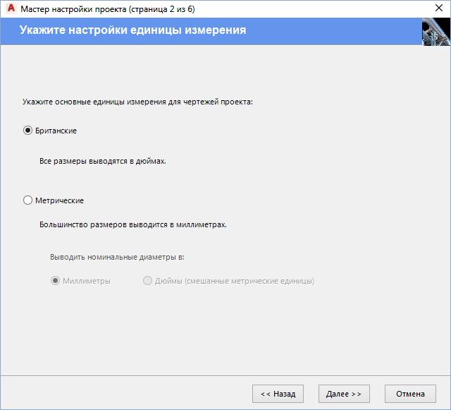 - В окне "Мастер настройки проекта (страница 2 из 6)" выберите единицы для проекта: британские или метрические. Если выбрана метрическая система, укажите единицы для номинальных диаметров на тот случай, когда компоненты созданы с использованием британских единиц. Нажмите "Далее".