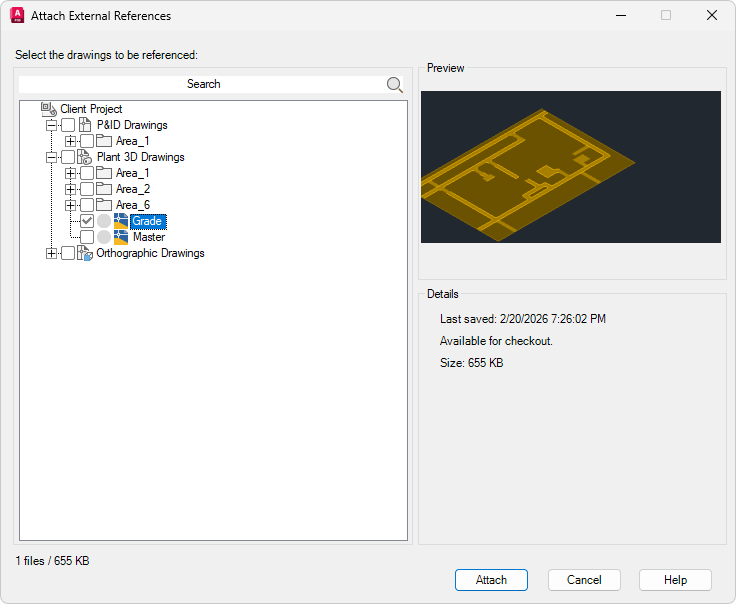 Этот метод можно использовать, чтобы прикрепить файлы AutoCAD DWG, которые не содержат объектов Plant, из любого места в хранилище.