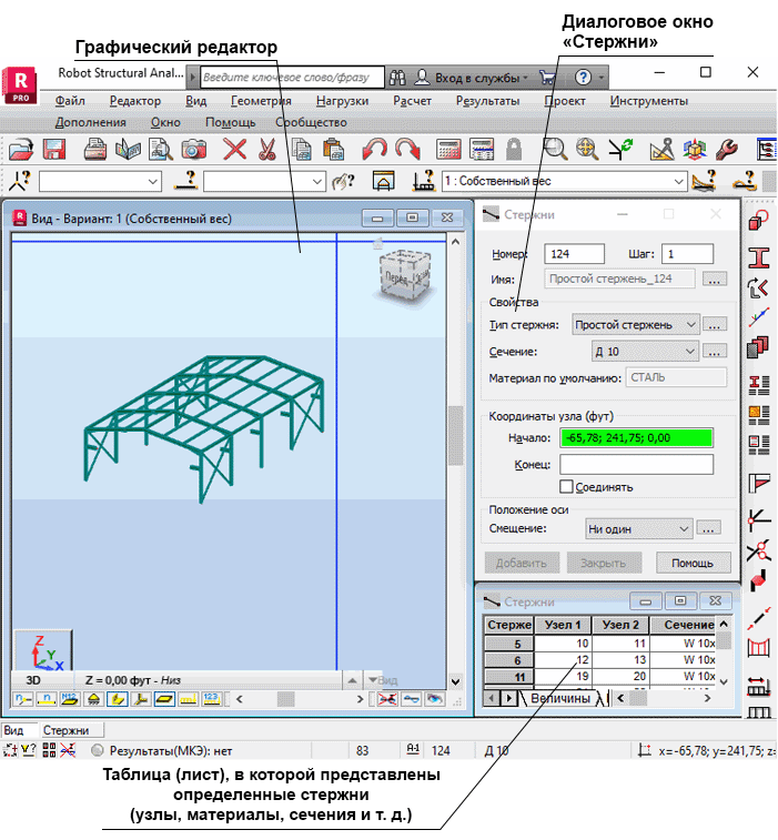 Пример использования компоновок: после выбора компоновки "Стержни" открывается эта система экранов. Обратите внимание на то, что для лучшей читаемости изображения диалоговое окно "Инспектор объектов" на нем не показано.