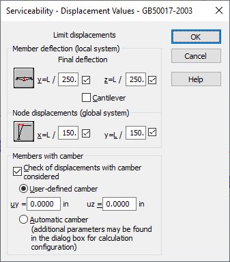 Эта опция используется для задания дополнительных параметров норм, определяющих значения перемещений (предельные перемещения). Она доступна после нажатия кнопки "Сервис" в диалоговом окне Определение элемента. Параметры.