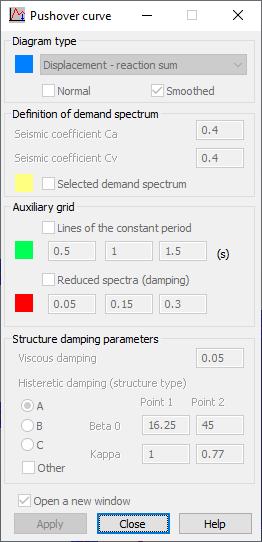 Для гистерезисного затухания выбирается тип конструкции (A, B или C); параметры "Бета0" и "Каппа", применяемые при вычислении эффективного затухания, вычисляются в программе и отображаются в соответствующих полях на сером фоне. Эти значения можно задать самостоятельно, если включен параметр "Другие"; при этом становятся доступными поля "Точка1" и "Точка2". Значения коэффициентов "Бета0" и "Каппа" должны быть положительными.