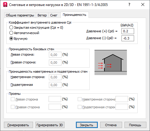 При переходе в диалоговом окне Снеговые/ветровые нагрузки на вкладку Проницаемость открывается следующее диалоговое окно.
