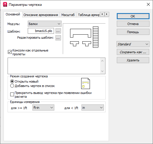 Если включена опция Консоли как отдельные пролеты, то консоли балки или подпорной стенки будут рассматриваться как пролеты балки. Если опция выключена, то консоли будут представлены на чертеже вместе с ближайшим пролетом.